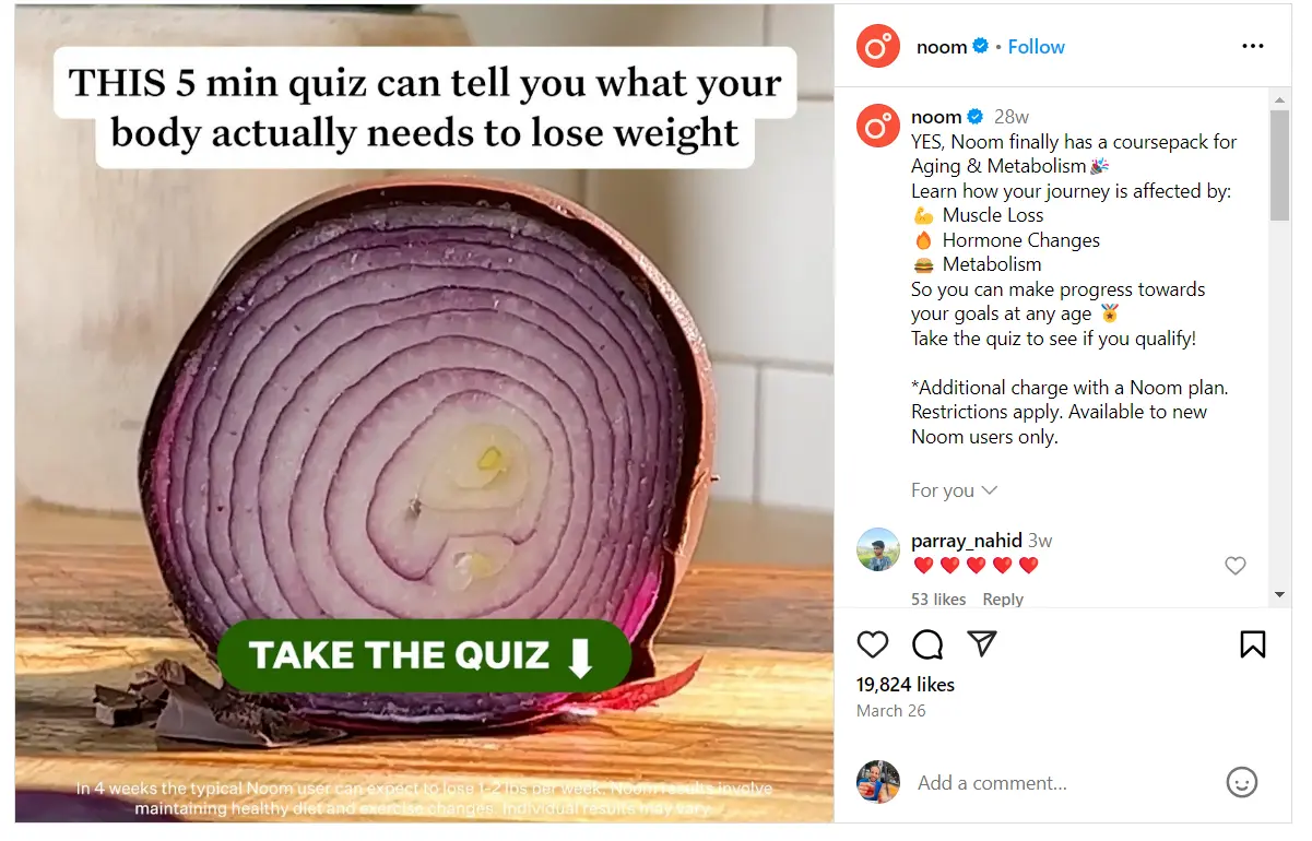 There are quite a few reasons we gave this ad a second look. First, I’d never think of an onion in the context of a nutrition app ad. So, naturally, it grabs the attention.