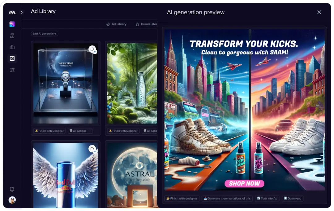Find ideas for your future ads with our Creative Workflow and the cool AI Ad Generator we've got. With it, you can do so many things within the ad production cycle. First, you can browse our Ad Library for ideas. We've added AI search to help you find just the right examples quickly. You can then create ads with AI and base them on your favorite ad examples. Experiment with your images, or just type in the prompt.